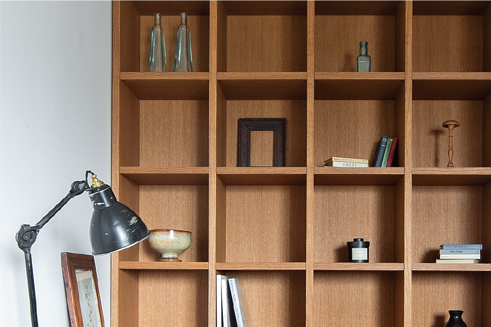 オイル仕上げのナチュラルな木の色と白い壁、真鍮の金具。何年経っても飽きのこないDEN PLUS EGGのスタンダード・スタイル。キッチンと洗面所にあしらわれたアルチザンタイルの手仕事の肌触りがアクセントをプラスします。本をたっぷりと置ける壁面いっぱいの書棚のあるご主人の書斎兼子供部屋、お菓子づくりの作業スペースをたっぷりと取ったコの字型キッチン、子どもの誕生を機にお家をつくったふたりが、子どもの成長と一緒に育てていける住まいになりました。
